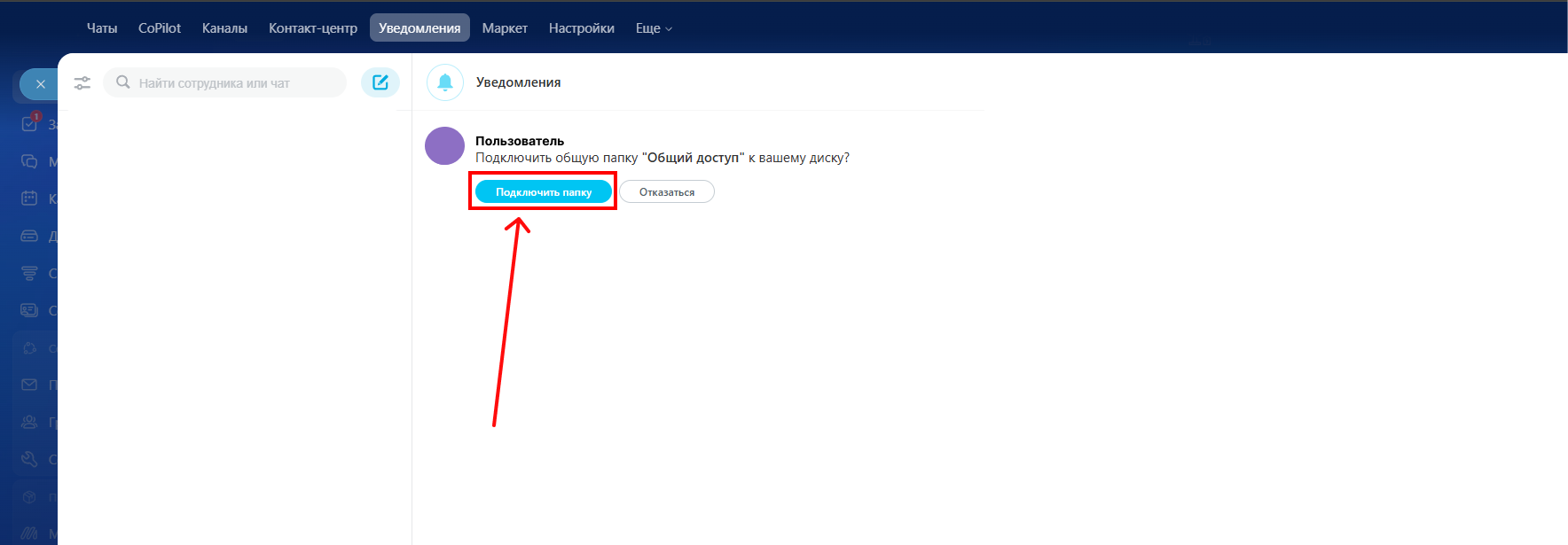 Чтобы файл отображался в разделе "Диск" приглашение необходимо принять, сделать это можно в разделе уведомления.