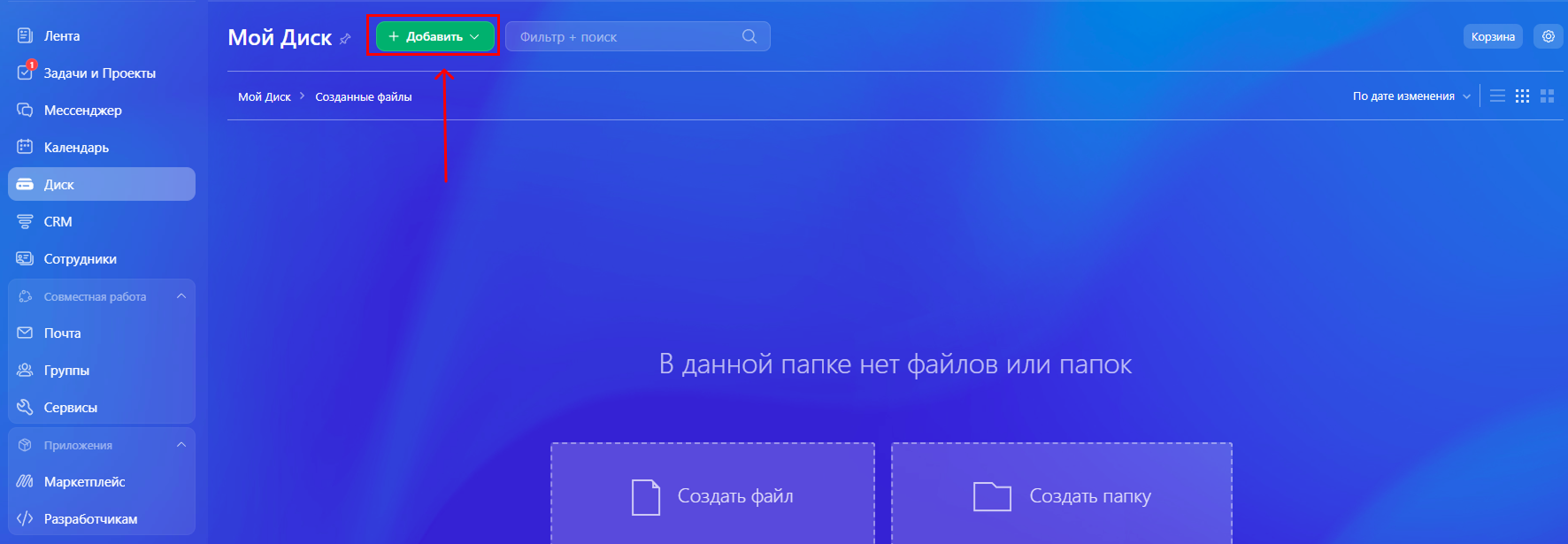 Для создание общего документа и управление доступа необходимо перейти в раздел "ДИСК" в Битрикс24.