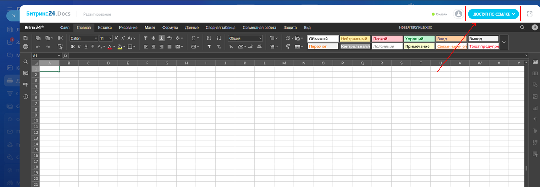 В открывшемся окне, вы уже можете редактировать документ, а для предоставление доступ сотрудника, необходимо нажать "Доступ по ссылке"