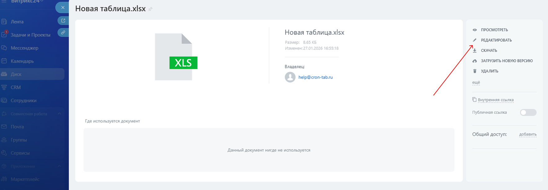 Для дальнейшего редактирование документа, а так же выдачи доступа другим сотрудникам, нажимаем на значок, показанным на снимке ниже: