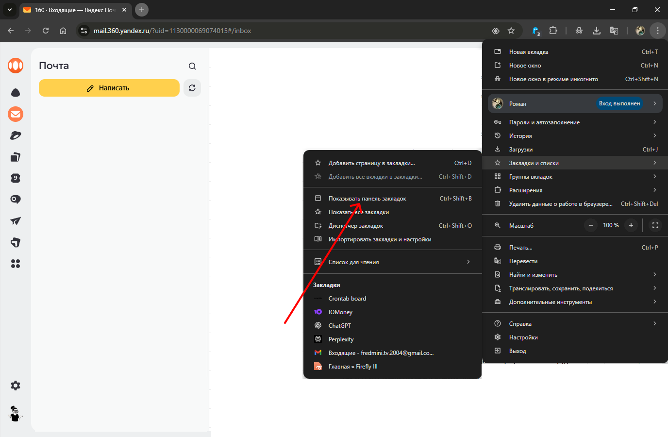 1.2 В выпашем меню, выбрать пункт "Закладки и списки" - выбрать пункт "Показывать панель закладок"