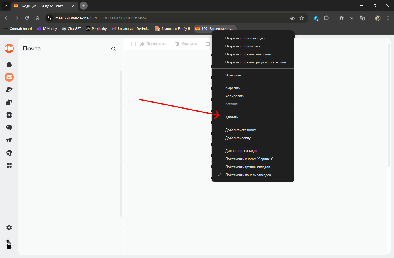 3.1 Для удаление закладки, используем ПКМ (правой кнопкой мыши) по нужной закладке и в выпашем контекстном меню, выбираем пункт "Удалить".