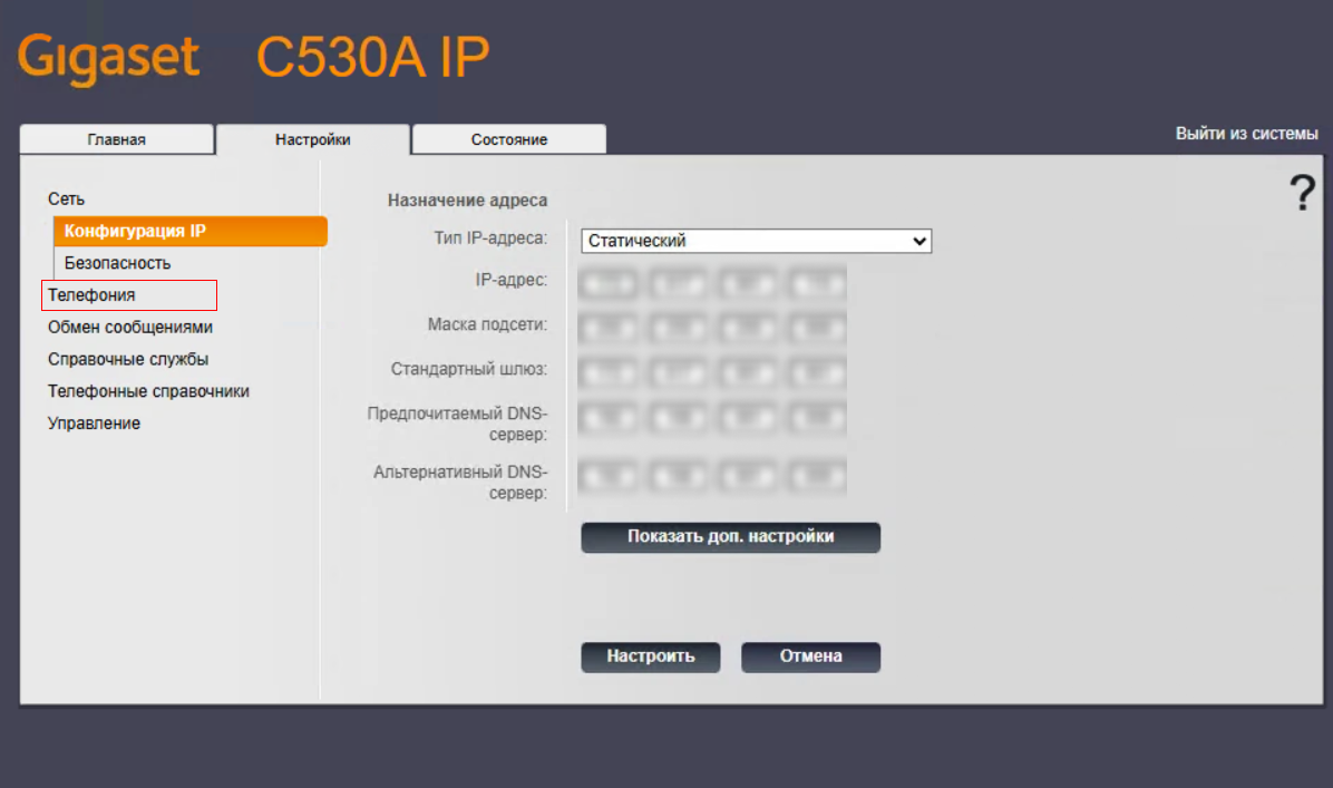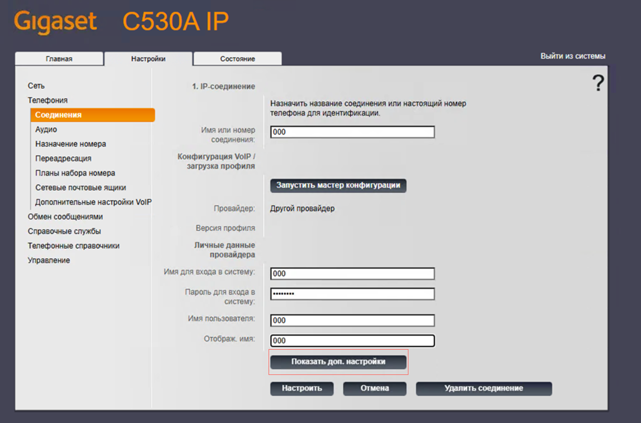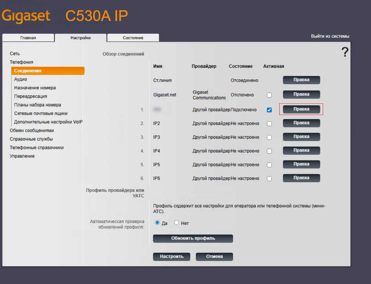 Настройка профиля в базе Gigaset